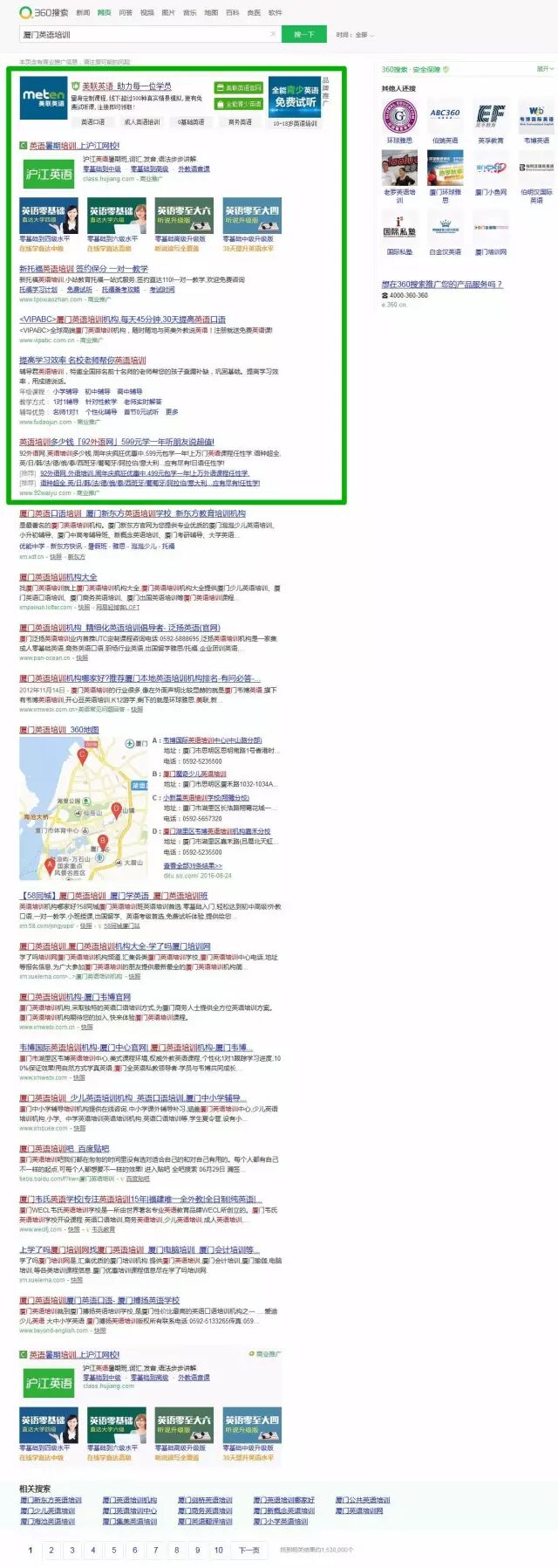 360推广,左侧上方:6个广告位,下方1个。据说前一段时间360在测试右侧广告位的使用反响,估计右侧恢复已成必然。