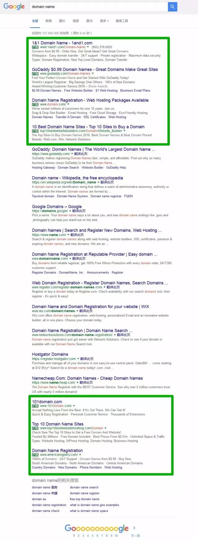 谷歌Adwords,左侧上方:4个广告位,下方:3个广告位,关键是上方与下方广告不一致。